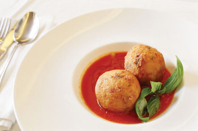 - יוצקים את רוטב העגבניות לצלחות הגשה עמוקות. מניחים 2 כדורי ארנצ'יני במרכז כל צלחת, מקשטים בעלי בזיליקום טריים ומגישים.