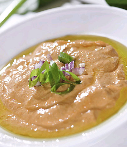 - מעבירים את המטבל לקערת הגשה, מזלפים שמן זית ומעטרים בטבעות בצל ירוק.