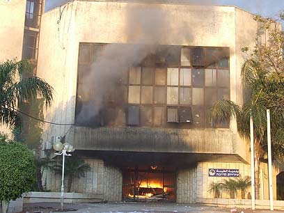 מסוכן. בניין עיריית טייבה עולה באש (צילום: מוחמד שינאווי)