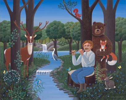 "הציור 'סרנדה אקולוגית' מתאר את ההרמוניה בין אדם לטבע. כמו אורפאוס, הדמות הזאת מנגנת מוזיקה מתוקה לחיות הסובבות אותה. המים, מקור החיים, חוצים את מרכז הסצנה הכפרית הזאת. יכול להיות שזהו הבוקר הראשון של העולם".