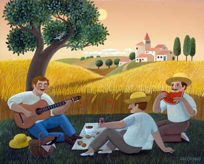 "הרעיון בציור 'פיקניק בשדה' הוא לחלוק, בין חברים, את הרגעים הטובים של החיים. השמש הקיצית על שדות חיטה, פיקניק ספונטני בליווי מוזיקה מתוקה. הרגע הזה הוא בו בזמן תענוג ושלווה".