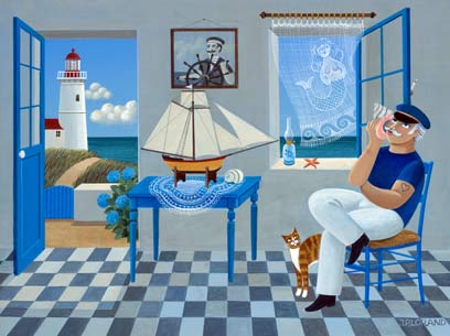 "כותרת הציור 'נוסטלגיה לים' מסכמת את חייו הארוכים של מלח, מלאי נסיעות וזיכרונות. הדלת פתוחה ורואים את הים מרחוק. רגלו של חתול חוצה את החדר, וילון התחרה עם תמונת בת-הים מתעופף עם משב הרוח".