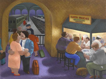"הציור 'תחנת רכבת' מתאר זיכרון אישי וישן: בצעירותי גרתי קרוב מאוד לתחנת רכבת, ונהגתי לבלות את זמני בלהביט באנשים נפגשים ונפרדים, אולי לנסיעת עבודה, אולי פרידה סופית. במקרה ספציפי זה רואים זוג עם ילדם, נפרדים מהגבר, בו בזמן נרגשים ועצובים בגלל הפרידה, אבל מלאי תקווה לקראת חזרתו ובואו של עתיד טוב יותר. בעצם נושא תערוכת היחיד הראשונה שלי היה רכבות והעולם שמסביבם".