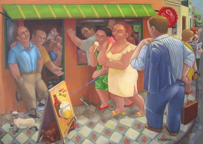 "הציור 'ערב לחך' מתאר סצנה מסורתית בעיר שלי: אחר הצהריים קיצי, כמה גברים בבר רואים משחק כדורגל בטלוויזיה, בזמן שגברים אחרים רואים את המשחק עם עין אחת ועם העין השנייה מביטים בשתי נשים יפות האוכלות גלידה. למרות הקצב המהיר של הערים הגדולות, אני מתענג על העובדה שאנחנו תמיד יכולים למצוא דקה ליהנות מהמראה של אישה יפה, וכדורגל איכותי".