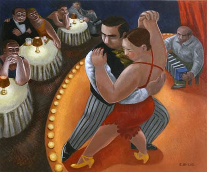 "טנגו הוא ריקוד מסורתי בבואנוס איירס. הוא נולד במאה ה-19 כתוצאה מערבוב של אנשים מקומיים ומהגרים חדשים. בתחילתו היה פופולרי ושייך למעמד הנמוך, אבל עם הזמן התפשט לשאר החברה. בימינו אנשים מכל רחבי העולם מגיעים לבואנוס איירס ללמוד את הכוריאוגרפיה שלו. הדבר שמסקרן אותי הכי הרבה כפי שניתן לראות בציור 'מופע טנגו' הוא שאתה יכול לראות רקדן חובבן, או אפילו מישהו כמוך או כמוני, ועדיין יכול להרגיש תשוקה חזקה מתנועות גופם".