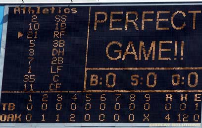ככה חוגגים את יום האם. הזורק הצעיר (26) של אוקלנד אייז, דאלאס בראדן, נכנס לפנות בוקר (ב') לספרי ההיסטוריה של המשחק, לאחר שזרק פרפקט גיים - משחק בו הוא פוסל את כל 27 החובטים שעלו מולו.