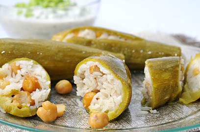 - ממלאים את הקישוא על למחציתו בתערובת החומוס והאורז (יש להשתדל למלא באופן שווה אורז מול חומוס).