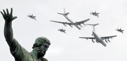 מטוסים מעל הכיכר האדומה ואנדרטת מינין ופוז'רסקי (צילום: AFP)