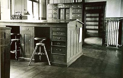 11-10. המשרד של המפעל בלייפציג. כדאי לשים לב לפרטי הנדסת אנוש שהשקיעו ה'יקים' בפריטי הריהוט המשרדי, שנכונים גם כיום: משטח השולחן מוטה בזווית נוחה ליושב לצידו. עוד לא המציאו כסאות הידראוליים אבל ניתן לכוון את גובה הכסא עם בורג. שפופרת הטלפון בגודל ראש אדם והמנורות מעל השולחן ניתנות לכוון בעזרת גלגלות. מגרסות נייר לא היו, אבל התנור שימש לצורך שריפת נייר במקום, וחום השריפה שימש גם לחימום