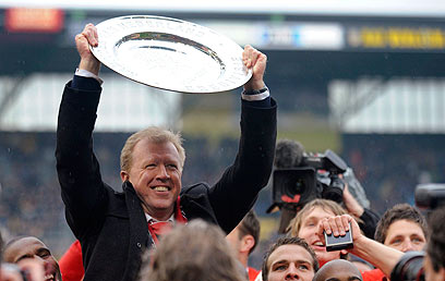 סטיב מקלארן חוגג עם צלחת האליפות. בינתיים הוא הספיק לעזוב (רויטרס)