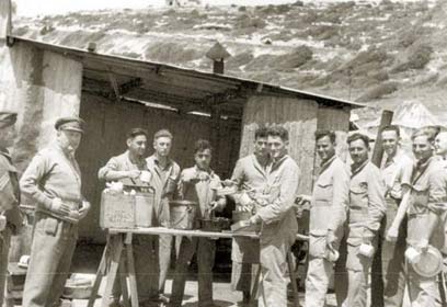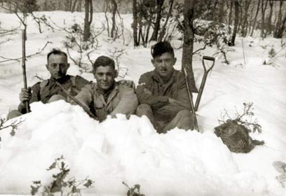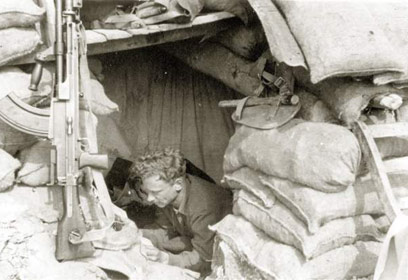 13. בחודש נובמבר 1944 עולים חיילי החי"ל על אוניות במצרים, בדרכם להשתתף בקרבות נגד הגרמנים בצפון איטליה. בתצלום: צבי בפתח הבונקר בקו החזית ליד Faenza בלחימה באיטליה, מרס 1945