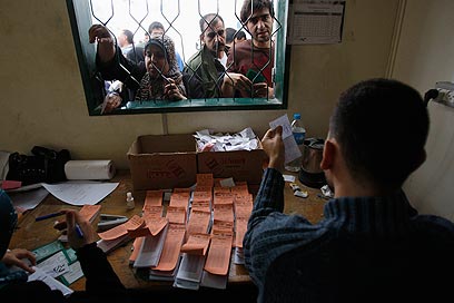 עזתים מקבלים תלושי סיוע הומניטרי מאונר"א (צילום: AP)
