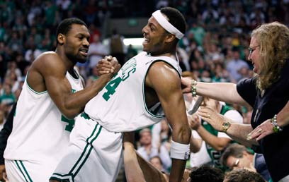 פירס וטוני אלן חוגג עלייה לגמר. הסלטיקס ברחו ברבע השני (צילום: AP)