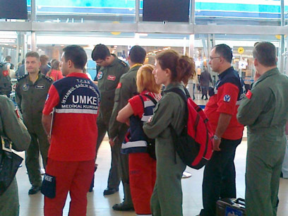 ממתינים בסבלות בנתב"ג. הצוות הטורקי (צילום: יואב זיתון)