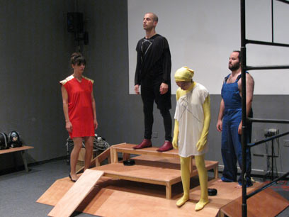 השחקנים עומדים על הפסל, שעושה סאונד. תשלובת "שישי"