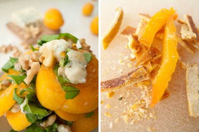 המשמשים מבושלים עם מעט מאוד דבש, והטעם המרוכז של המשמשים משתלב נפלא עם הווניל והשקדים. קומפוט נפלא שעושה שימוש גם בפרי המשמש וגם בשקדים שבגוגואים. להגשה מעל יוגורט או מאפה, ואפשר גם לשלב עם גבינת הסטילטון שנותרה מהסלט.