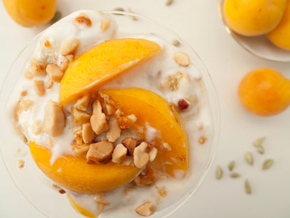 - מפזרים את יתרת המשמשים מעל היוגורט.