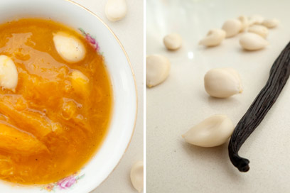 - בסיר כבד מניחים את פרוסות המשמש, מקל הווניל, והדבש ומכסים.