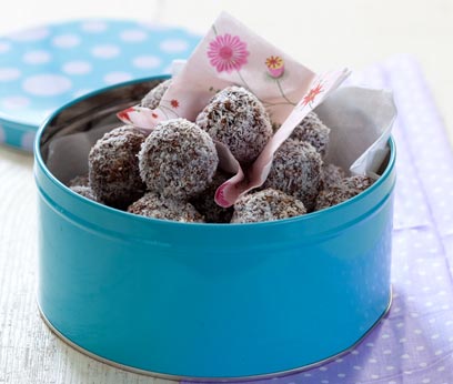 - מוציאים מהמקרר ויוצרים כדורים בקוטר 3 ס"מ (אם התערובת שהתה במקרר יותר שעות והתקשתה, ממתינים כמה דקות כדי שתתרכך מעט ואז יוצרים כדורים). מגלגלים בקוקוס או בשומשום.