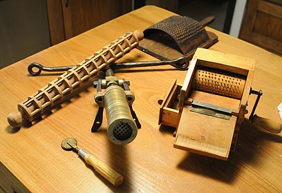 אביזרי פסטה נוסטלגיים מהאוסף הפרטי שלי, חלקם מסוף המאה ה-19: מערוך להכנת רביולי, מגררת לגבינת פרמזן, מגררת נוספת בצורת קופסה, גלגלת לחיתוך, אביזר נחושת ליצירת ספגטי