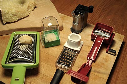 מגררות לגבינת פרמזן (מימין לשמאל): מגררת של "קיצ'נאייד" (155 ש"ח); "ארקוסטיל" (52 ש"ח); פטנט: קופסה לפרמזן מגורר - לוחצים ובוזקים על הפסטה לפי מידה (35 ש"ח); המגררת הירוקה של COSMOPLAST (כ-79 ש"ח), המגררת האחורית מאיטליה