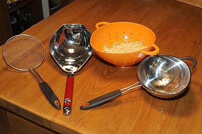 מסננות לפסטה (מימין לשמאל): מריו באטלי (129 ש"ח), קיצ'נאייד (75 ש"ח), מסננת כתומה של מ.ב (109 ש"ח), שולה רביולי של מ.ב. (109 ש"ח)