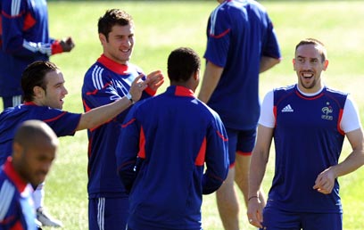 חיוכים בנבחרת צרפת. ריברי והחבר'ה מעניקים צ'פחה ידידותית לחבר (AP)