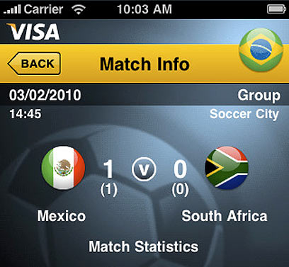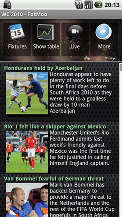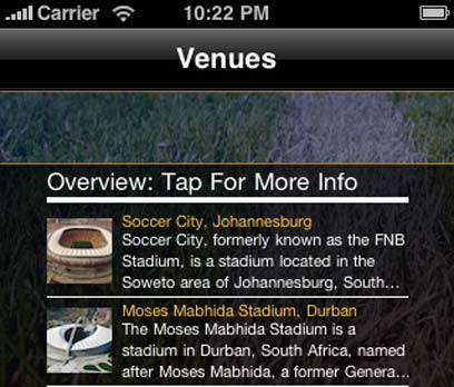 אפליקציה שמציעה מידע בכל התחומים הקשורים לתחרות המונדיאל 2010 בדרא"פ. תוכלו לקבל את כל האינפורציה שתרצו: שיבוצים, מידע על נבחרות ואצטדיונים וכמובן - החדשות העדכניות ביותר, הכול במרחק נגיעה.