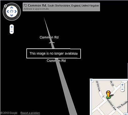 שיטוט בדרך Common בוולברהמפטון שבאנגליה, בשירות Street View של גוגל, יחשוף באמצע מסך שחור וכיתוב שלפיו התמונה אינה זמינה עוד.