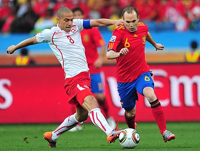 אנדרס אינייסטה מספרד עם השוייצרי גוקהאן אינלר (AFP)