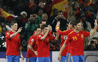 נבחרת ספרד חוגגת את הצמד של וייה (AFP)
