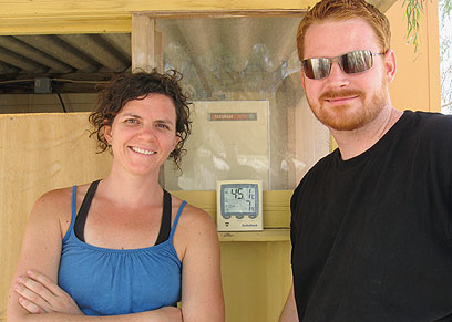 דרק וקייט ביישר, בני זוג מוורמונט שבארה"ב, מקדישים את חייהם לשיקום האתר הארכיאולוגי במועצה האזורית תמר. בימים האחרונים, הם מספרים, אי אפשר לצאת לעבוד במהלך היום. "אנחנו קמים לפנות בוקר, ובסביבות 10:00 היום נגמר. אין דרך אחרת לנצח את השמש. לכלב עשינו בריכה והוא רובץ בה כל היום. בימים האחרונים המזגן שלנו התקלקל מרוב עומס, והטמפרטורה בקרוואן מטפסת בשעות הצהריים".