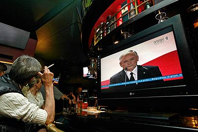 ירוסלב קצ'ינסקי מופיע על המרקע בפאב ליד גדנסק (צילום: רויטרס)