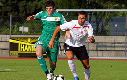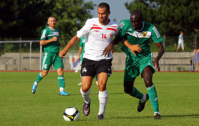 ערן זהבי מול אנז'י. "כיף לנסוע עם החבר'ה" (צילום: אתר הפועל ת"א)