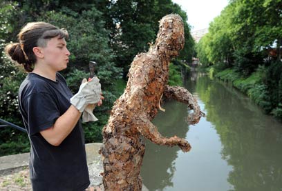 נציגה של קבוצת "Le Phun" מעצבת פסל על גדות התעלה (צילום: AFP)