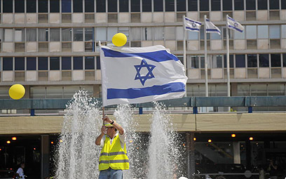 אחד מאלפי המפגינים בכיכר רבין, היום בעצרת (צילום: ירון ברנר)