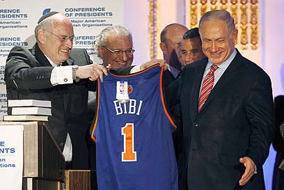 השחקן מספר אחד. נתניהו מקבל חולצה של "ניו יורק ניקס" (צילום: רויטרס)
