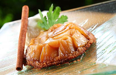 פרוסות של תפוחי עץ מקורמלות עם טאץ' של יין לבן נאפות תחת שכבת בצק אגוזית - זוהי הגרסה של השף רושדי דקוואר לטארט טאטן הקלאסי