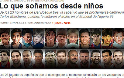 הכותרת המבריקה ביותר ללא ספק היא של אתר "המארקה" הספרדי, שרשם בראש העמוד שלו "מה שחלמנו עליו מאז היינו ילדים קטנים" וצירף תצלומים של שחקני הנבחרת מתקופת ילדותם. לתמונות מצורף הכיתוב "החלום קרוב מתמיד, התהילה מחכה לנו".