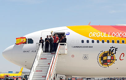 עם נחיתת המטוס בנמל התעופה של מדריד הונף דגל ספרד מחלונותיו, לקול שירת האוהדים 'ויוה אספנייה'. למטוס הוצמד שלט 'אלופים' והוא התקבל בזרנוקי מים בעת שנחת על המסלול. השאגות הלכו וגברו כאשר הקפטן איקר קסיאס והמאמן ויסנטה דל בוסקה יצאו מדלת המטוס, עם הגביע. כובש שער הניצחון בגמר מול הולנד, אנדרס אינייסטה, ירד ממדרגות המטוס כשהמדלייה על צווארו.