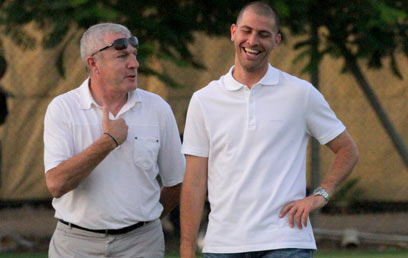 מצב רוח טוב באימון מכבי ת"א. נמני ופרננדז (צילום: אלי אלגרט)