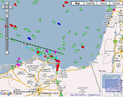 התקדמות הספינה, בחצים ירוקים עוכבים (מתוך אתר marinetraffic.com)