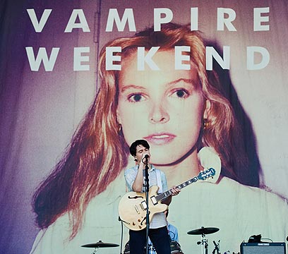 סולן הלהקה, עזרא קניג, על רקע תמונתה של קניס (צילום: getty images)