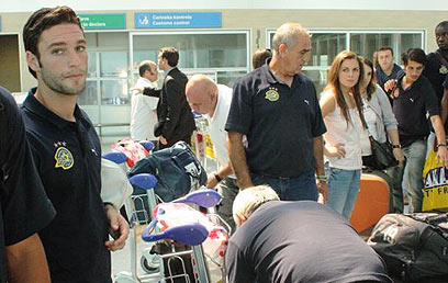 אבידור מחכה למזוודות בפודגוריצה (צילום: האתר הרשמי של מכבי ת"א)