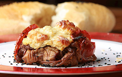 - מעליהם מניחים שכבה של החצילים, שופכים את התערובת, משטחים מעט ומכסים בעוד שכבת חצילים.