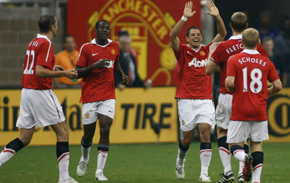 הרננדס חוגג עם סקולס, פלטשר, אושיי ודני וולבק (AFP)
