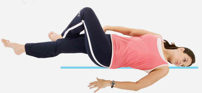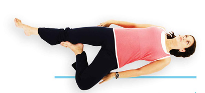 - שוכבים על הגב ומניחים את הידיים לצדי הגוף. רגל אחת ישרה על המזרן, והרגל השנייה מקופלת מעליה.