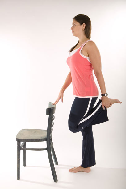 - יד אחת נתמכת במשענת הכיסא, והיד השנייה אוחזת בקרסול ומותחת את הרגל למעלה כלפי האגן.
