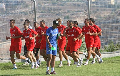 סואן ושחקני בני סכנין באימון הערב (צילום: חגי אהרון)