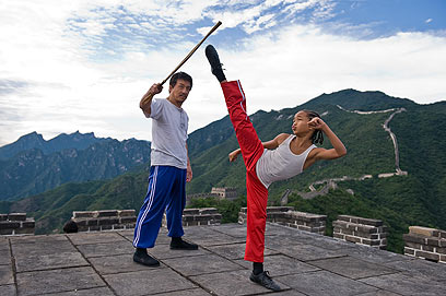 הסרט צולם בבייג'ינג המודרנית, אך כסרט חניכה לתרבות הסינית הוא גם מכיל ביקורים בעיר האסורה ובחומה הגדולה. כל זה עדיין בגבולות הסביר. המעבר מסין מציאותית לפנטזיה על המסורת הסינית מתרחשת בסצנה אחת בה לוקח מר האן את דרה לביקור בכפר ובמקדש שבו למד את הקונג פו של בני האור. במקדש על הר, בקצה עליה של אלפי מדרגות, מתאמנים בדממה המאסטרים מול הטבע. פנטזיה שנראית כלקוחה מסרטי אמנויות הלחימה של קינג הו.